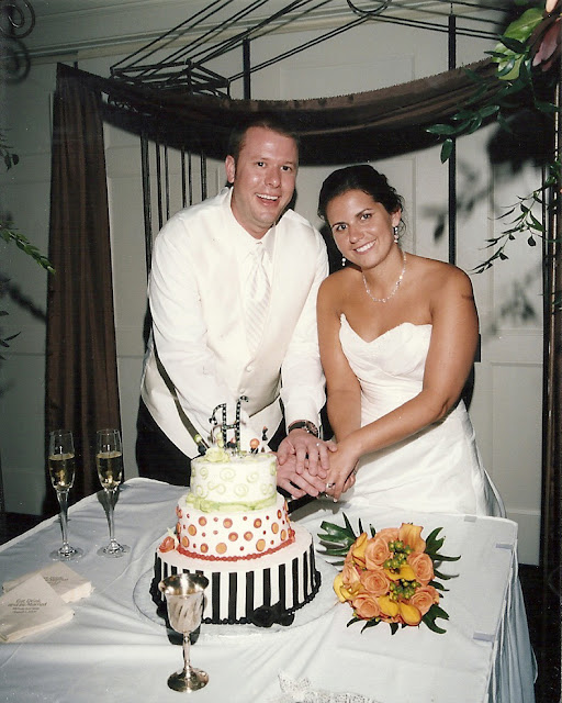 I am a huge chocolate-peanut butter fan, and because I wanted our wedding to be unique and reflective of us, I searched high and low for a baker who would make us a chocolate-peanut butter flavored cake (on a side note, our wedding was about a year before the cupcake craze hit Va. Beach...nowadays, this would not be difficult at all!). We did find someone though, and while I had more input on the flavor, Josh was actually a little outspoken (at least for him) on the look of the cake...random, I know.